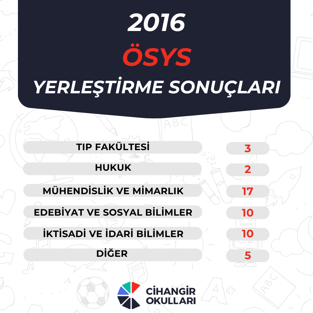 Cihangir Okulları olarak, öğrencilerimizi hayallerine ulaştırmaya devam ediyoruz! 2016 ÖSYS yerleştirme sonuçlarımız, öğrencilerimizin akademik başarılarının bir göstergesi ve bu gururu sizlerle paylaşmaktan mutluluk duyuyoruz.